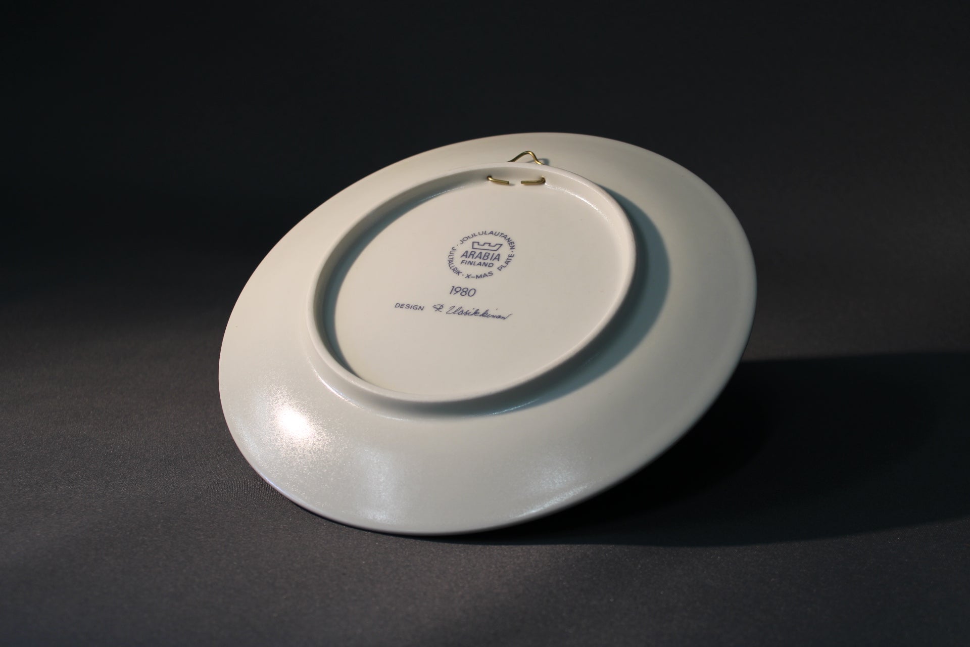 Tyylikäs Arabia joululautanen vuodelta 1980, suunnittelija Raija Uosikkinen. Tämä keräilylautanen on osa Arabian suosittua vuosittaista joululautassarjaa, joka tunnetaan taidokkaasta kuvituksestaan ja suomalaisen joulun perinteiden kuvauksesta.
