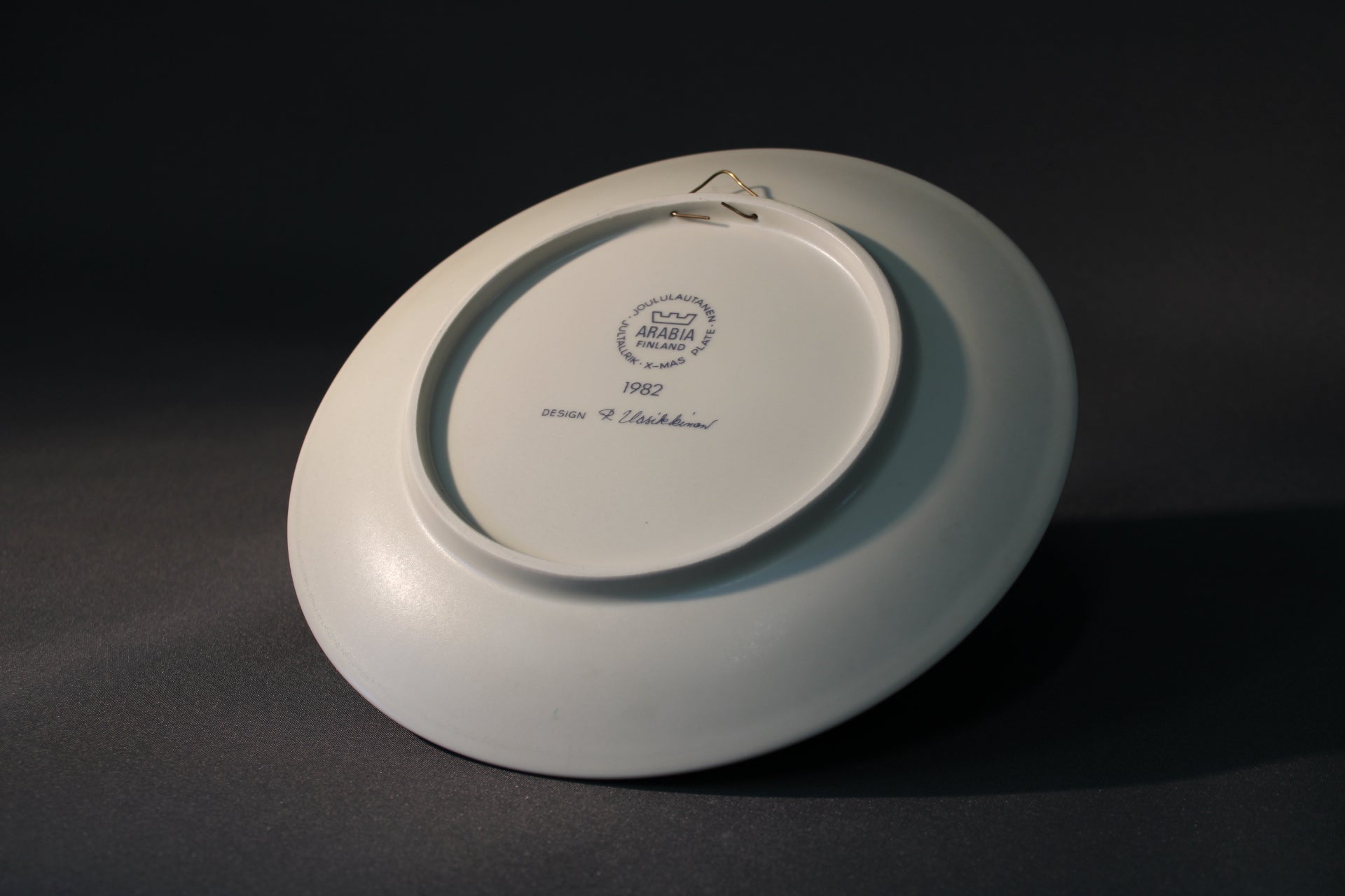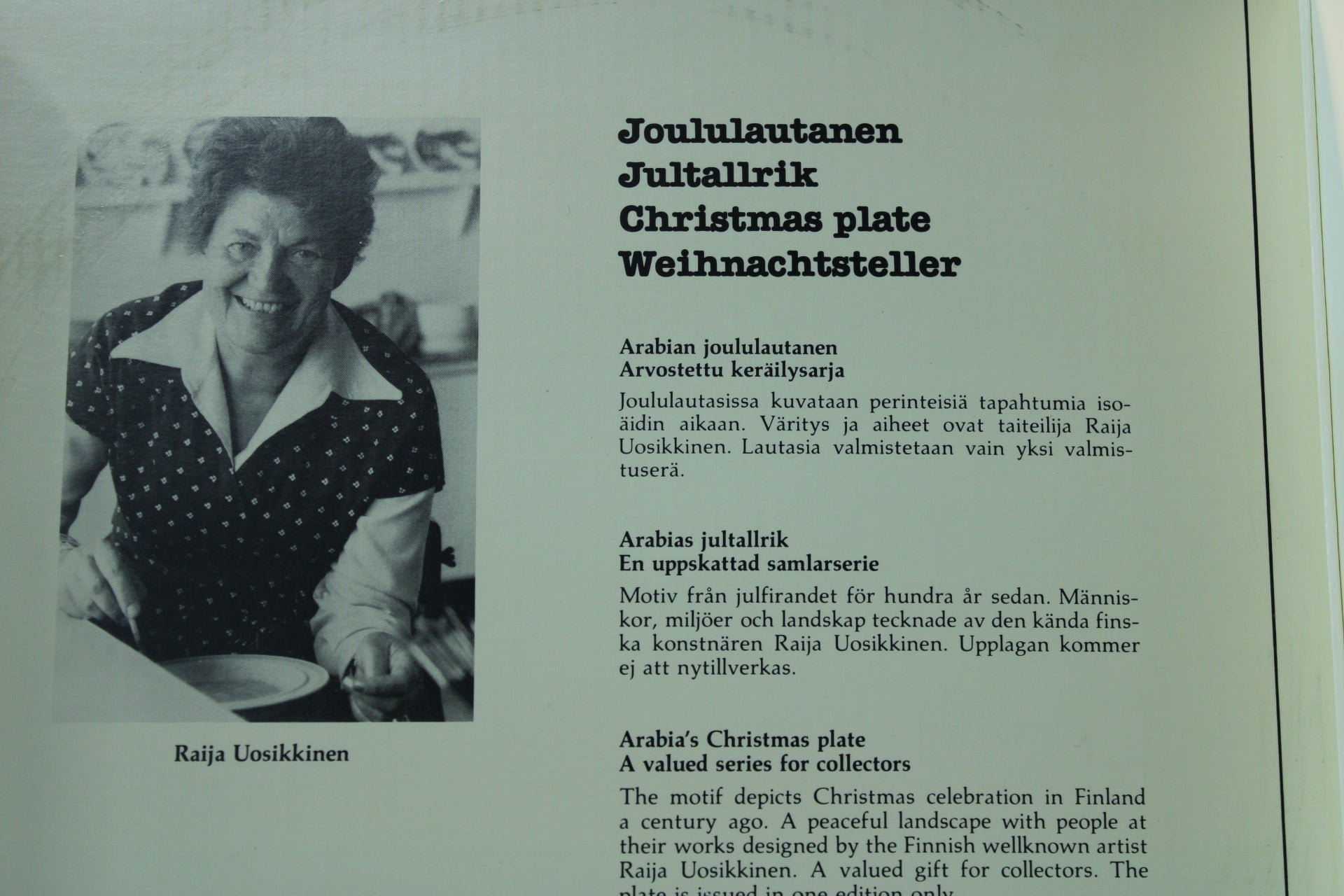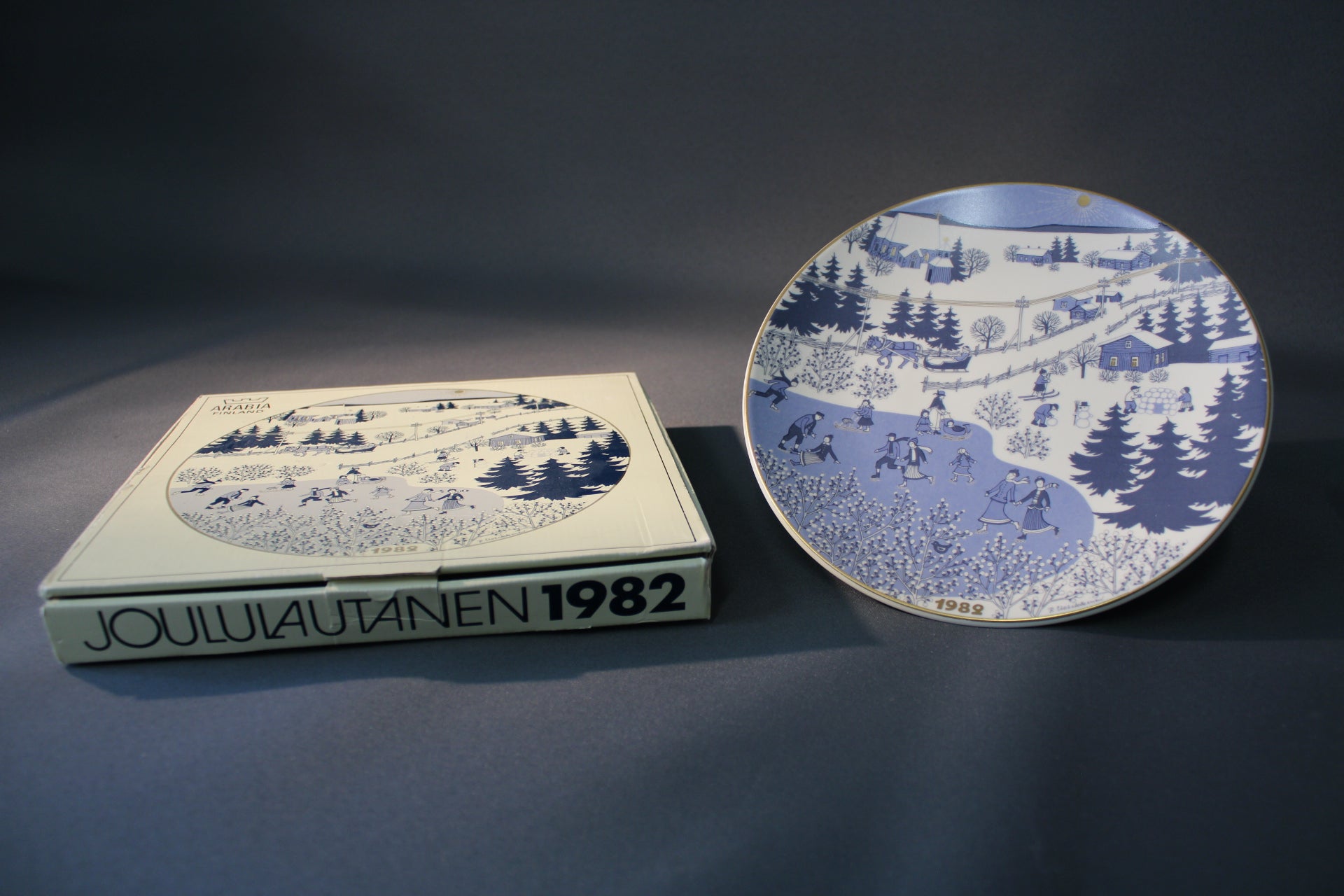 Kaunis Arabia joululautanen vuodelta 1982, suunnittelija Raija Uosikkinen. Tämä keräilylautanen kuuluu Arabian suosittuun vuosittaiseen joululautassarjaan, joka tunnetaan taidokkaasta kuvituksestaan ja suomalaisen joulun perinteiden kuvaamisesta.