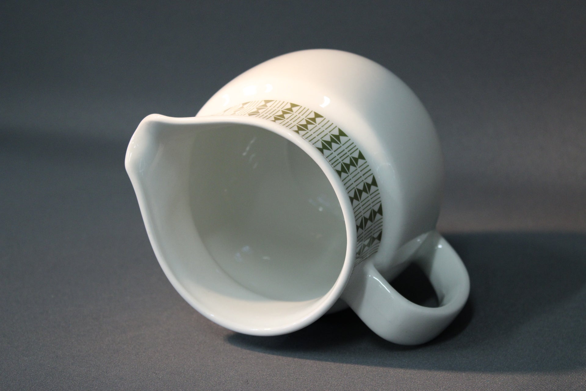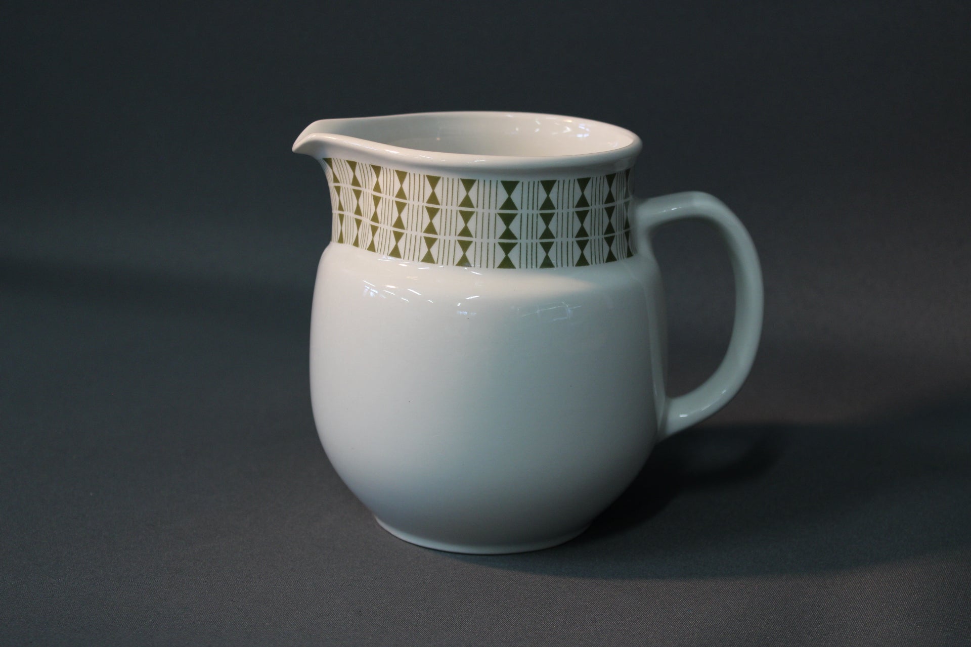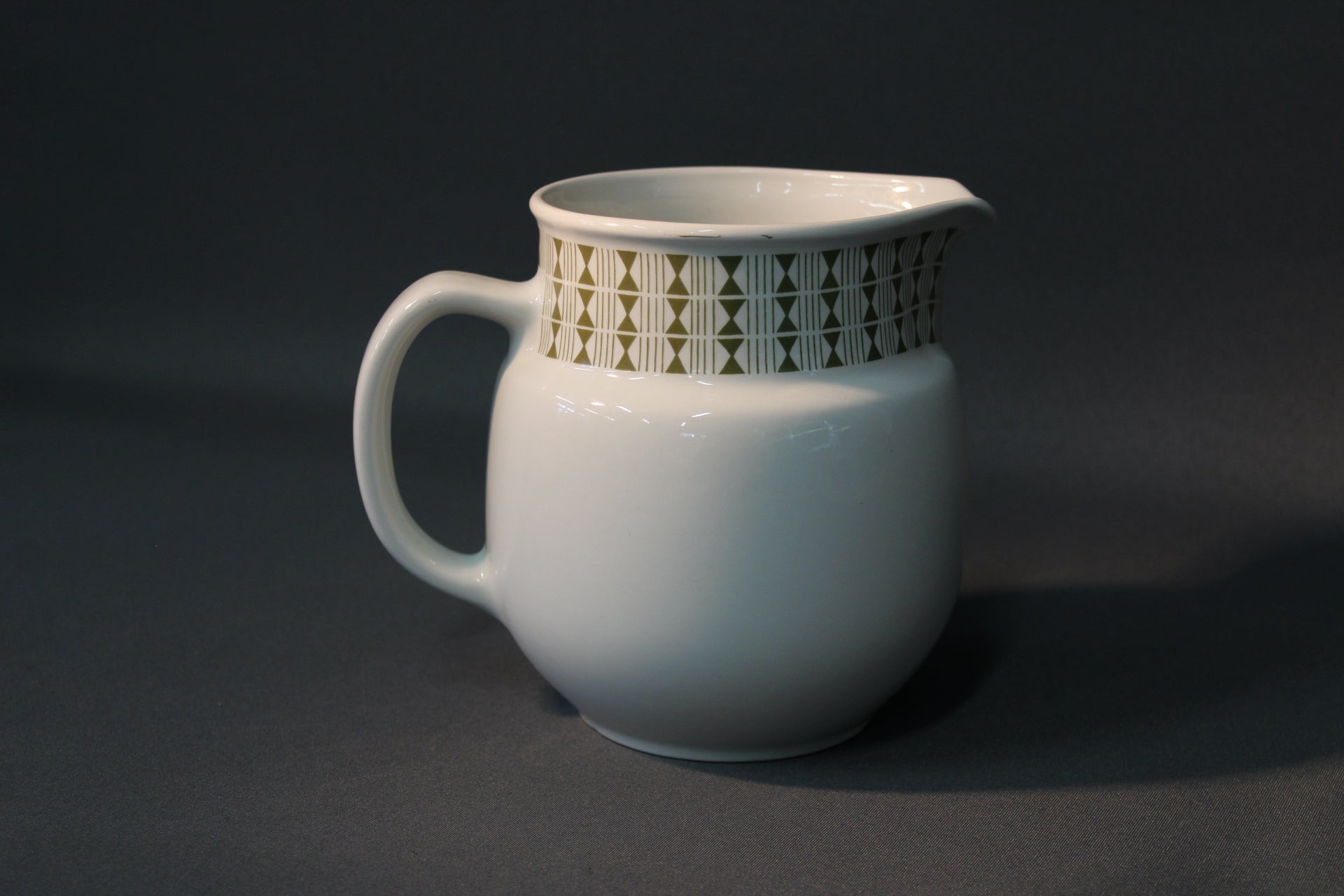 Arabian valmistama klassinen maitokannu, koristeltuna Raija Uosikkisen suunnittelemalla vihreällä Seita-serikuvakoristeella. Tämä kannu on valmistettu 1960-luvulla, ja sen yksinkertainen muotokieli yhdistettynä graafiseen koristeeseen tekee siitä sekä käytännöllisen että arvostetun keräilyesineen.