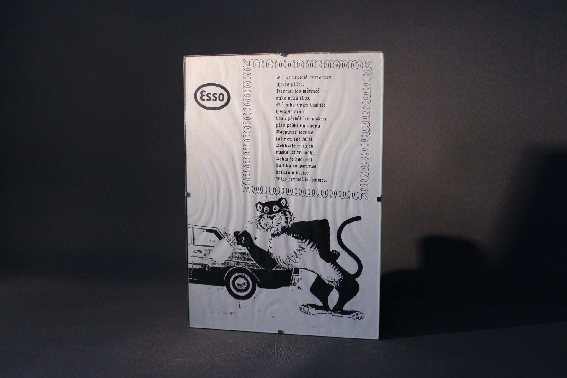 Vintage Esso-mainostaulu, jossa mustavalkoinen tiikerikuva ja humoristinen runo murteella. Todennäköisesti 1970-luvun huoltoasemien mainosesine, joka yhdistää retroilmeen ja ajankuvaa huokuvan huumorin. Sopii erinomaisesti keräilijälle, autoharrastajalle tai sisustukseen, jossa arvostetaan nostalgisia yksityiskohtia. Hyvässä vintage-kunnossa, lasipinta ja erillinen jalusta.