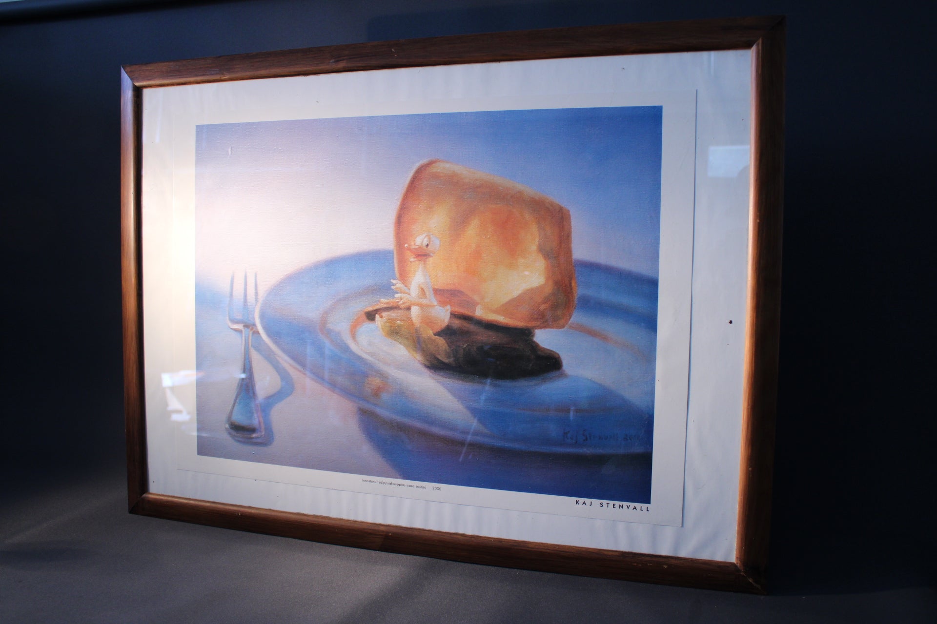 Kaj Stenvallin humoristinen ja surrealistinen teos Innostunut saippuakauppias osaa soutaa vuodelta 2000 on nyt modernina julisteena, printattuna ja kehystettynä puukehyksiin lasin alle. Signeeraus on osa julisteprinttiä, ei käsin lisätty.