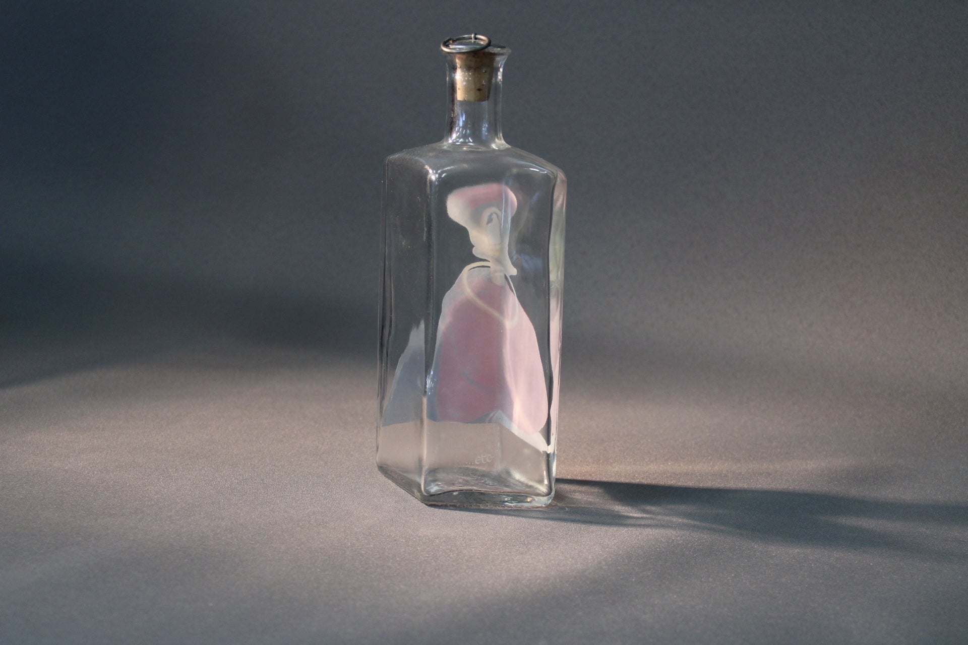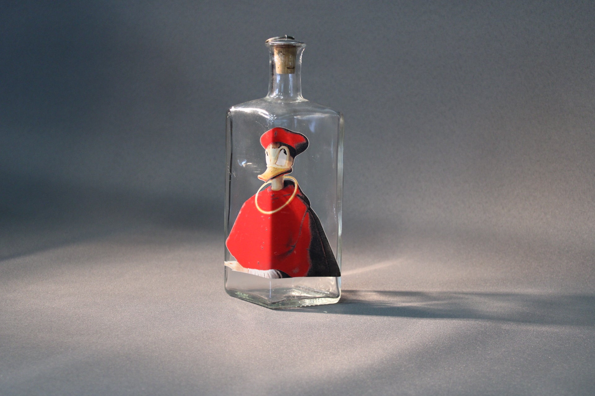 Uniikki Kaj Stenvallin suunnittelema taidepullo, jonka sisällä ikoninen ankkahahmo Stenvallin tunnistettavalla tyylillä. Pullo on kirkasta lasia ja suljettu alkuperäisellä korkilla. Taiteilijan signeeraus löytyy pullon pinnasta. Tämä on näyttävä keräilyesine Stenvallin taiteen ystäville.