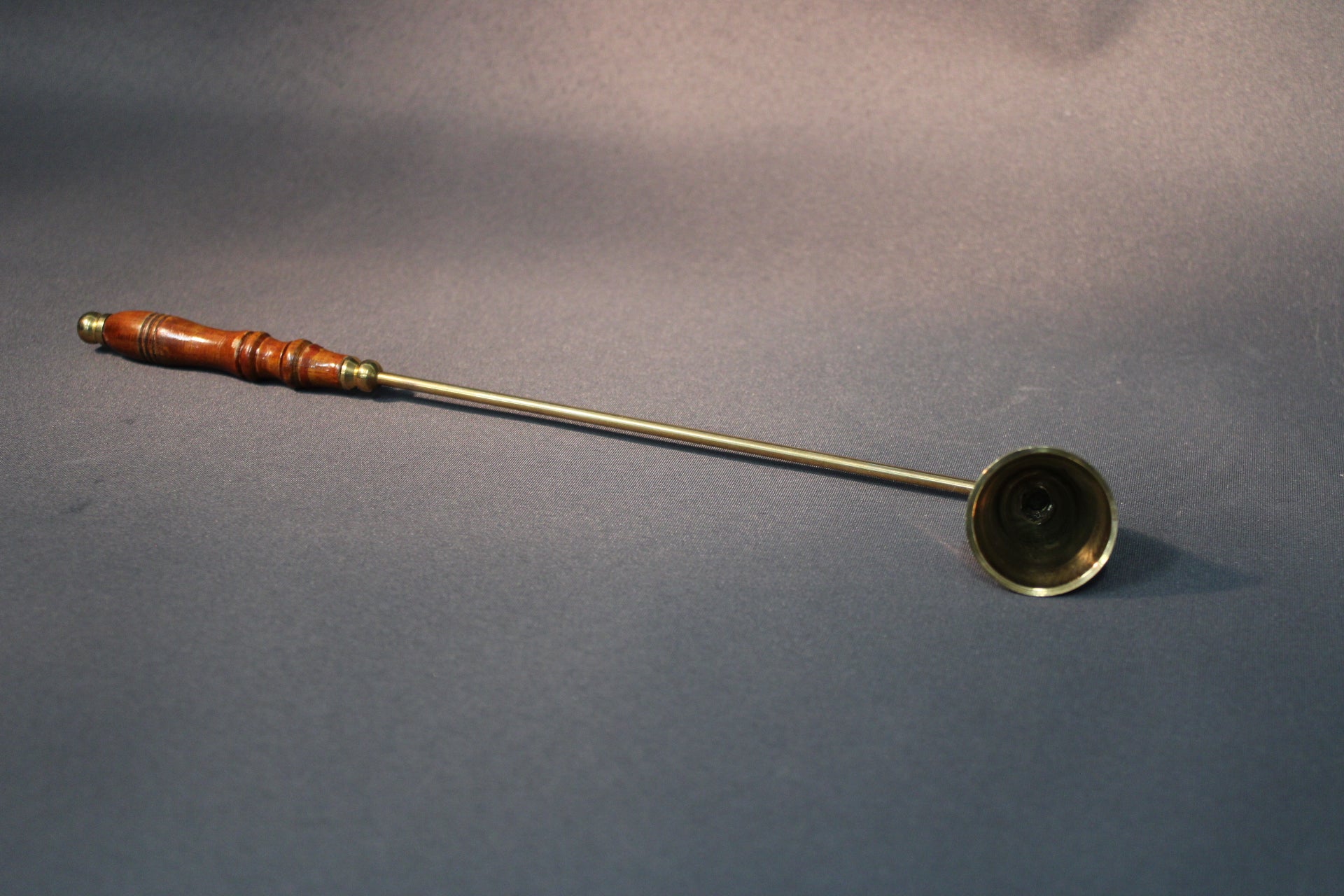 Tyylikäs messinkinen kynttilänsammutin, jossa on kauniisti muotoiltu puinen kahva. Sammutin on sekä käytännöllinen että sisustuksellinen esine, jonka avulla kynttilät saa sammutettua turvallisesti ilman ylimääräistä savun hajua. Klassinen muotoilu tekee siitä ajattoman lisän kotiin tai mökille.
