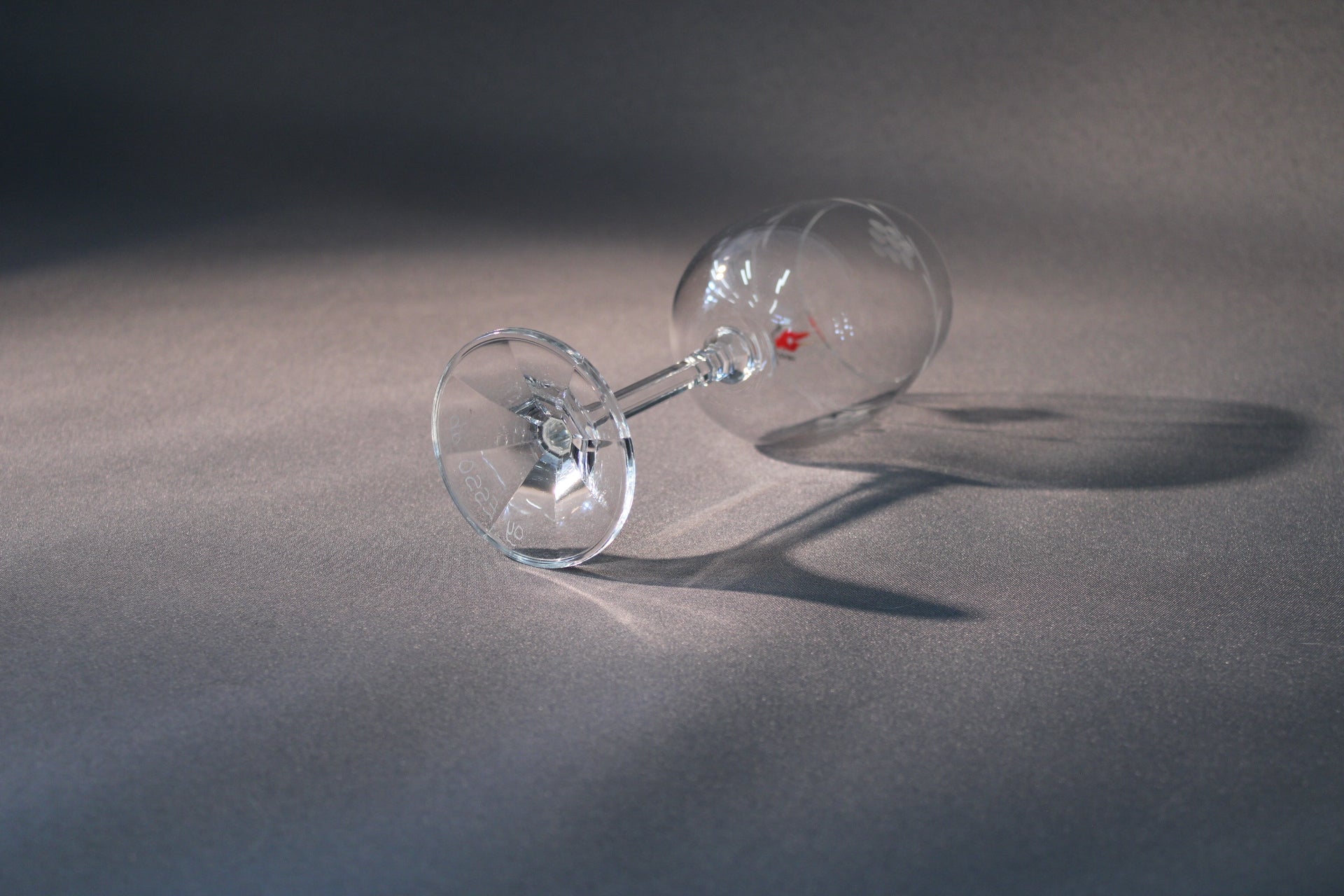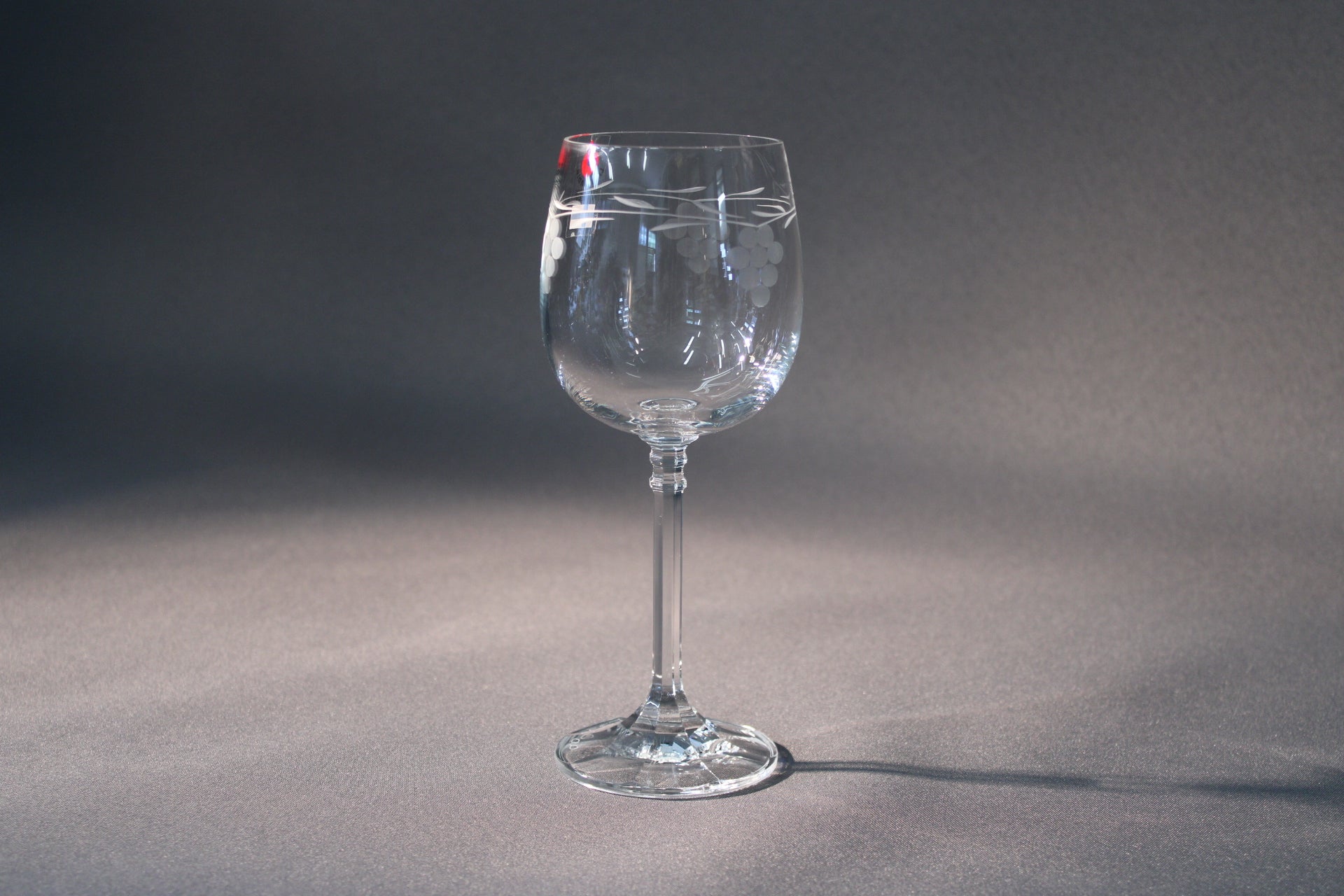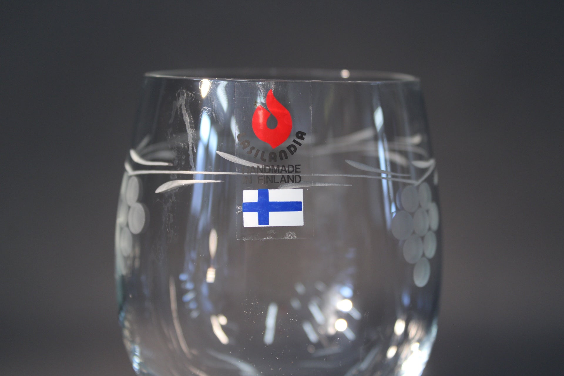 Tämä Lasilandian käsintehty viinilasi on tyylikäs ja nostalginen esine, jossa yhdistyvät perinteinen rypäleaiheinen kuvio, Oy Esso Ab -kaiverrus jalassa sekä alkuperäinen Lasilandia-tarra, jossa liekki ja Suomen lippu. Tarrassa lukee "Lasilandia – Handmade in Finland", mikä korostaa lasin kotimaista alkuperää ja käsityölaatua.