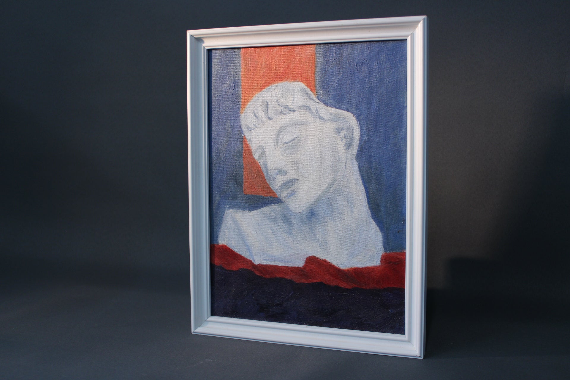 Tyylikäs moderni öljyvärimaalaus, jossa on kuvattuna klassinen veistosaihe rohkealla väripaletilla. Syvät siniset ja lämpimät punaiset sävyt luovat teokseen vahvan kontrastin, ja vaalea veistoshahmo tuo mukaan ajattoman rauhan tunnun. Maalaus on toteutettu kankaalle ja se on kehystetty valkoisilla puukehyksillä, jotka korostavat teoksen ilmettä. Takana on ripustuslanka valmiina, joten teos on heti valmis seinälle. Sopii hyvin niin moderniin kuin perinteiseenkin sisustukseen ja tuo tilaan taiteellista tunnelmaa.