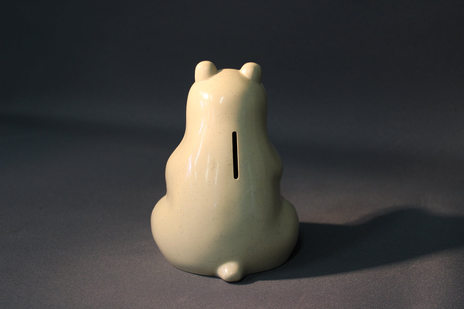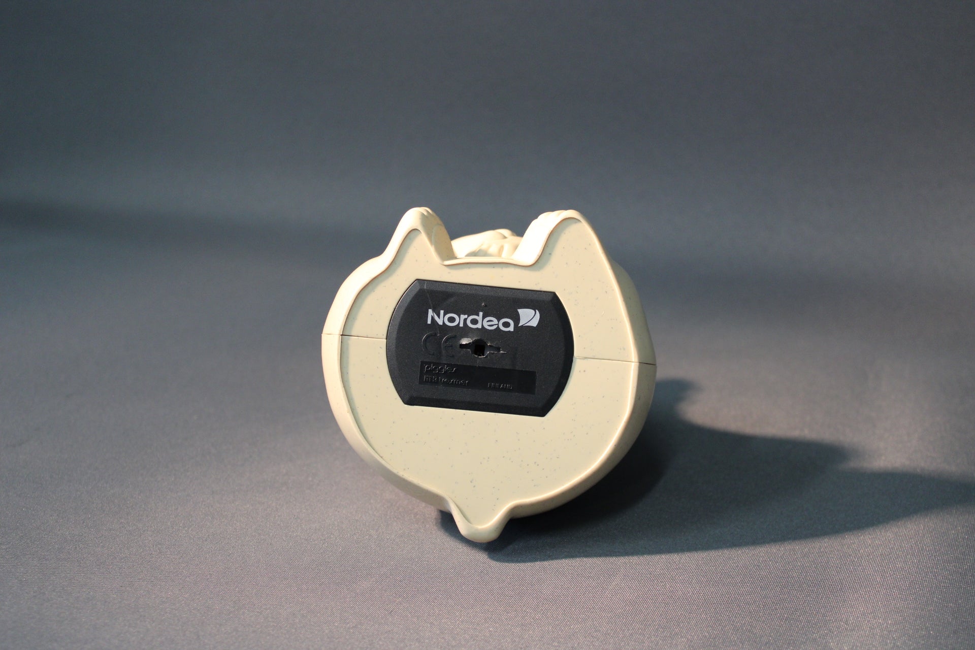 Hauska ja nostalginen Nordea-karhupankki, joka on ollut monen suomalaislapsen ensimmäinen säästölipas. Beige muovinen karhu istuu sympaattisesti ja kätkee kolikot sisäänsä selässä olevan aukon kautta. Pohjassa on avattava lukitus (Nordea-logo).