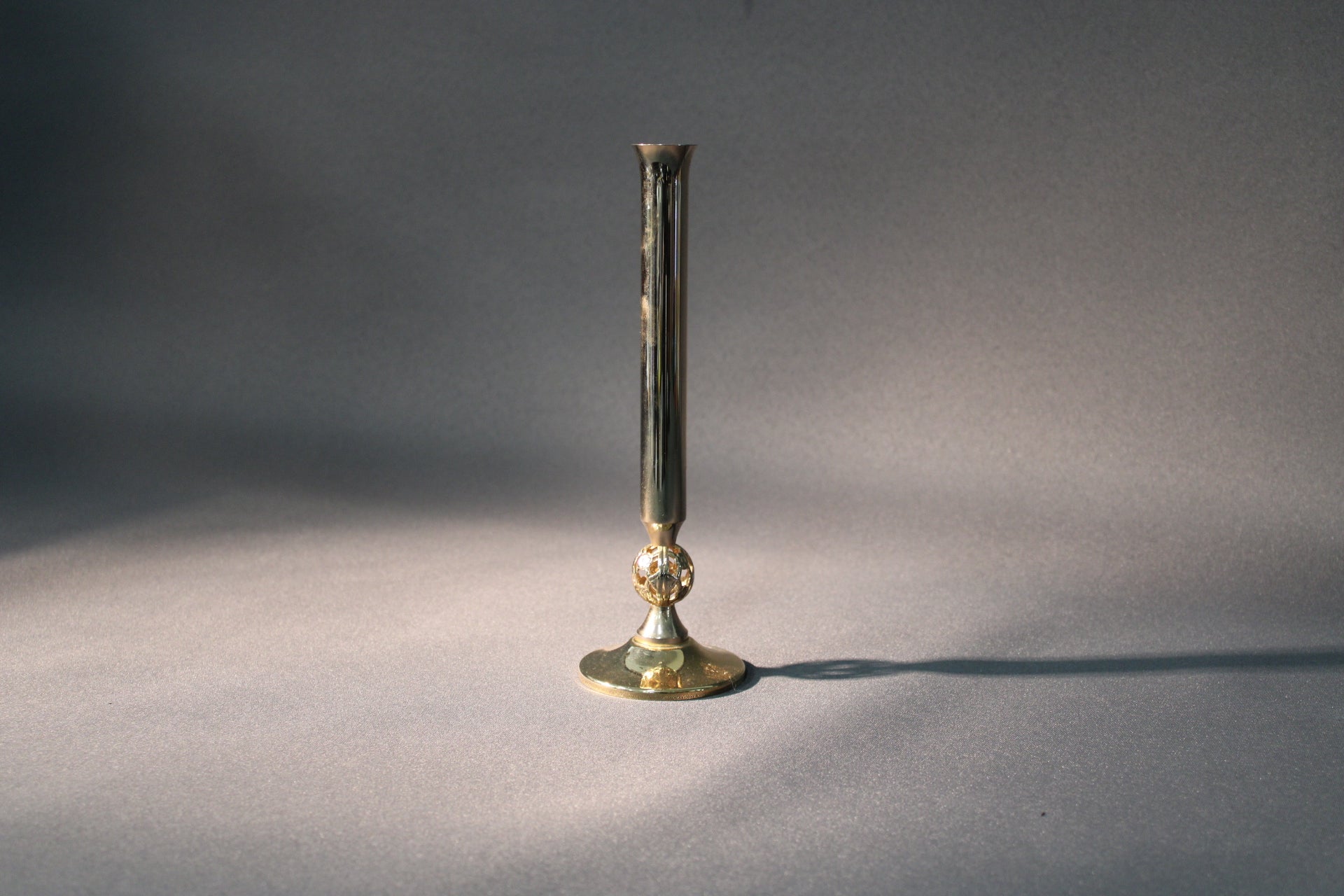 Elegantti ja siro orkidea-maljakko yhdelle kukalle. Maljakon metallinen, kullattu pinta heijastaa valoa kauniisti, ja jalassa oleva koristeellinen kristallimainen yksityiskohta viimeistelee ilmeen. Minimalistinen muotoilu tuo tyylikkyyttä niin moderniin kuin klassisempaan sisustukseen.
