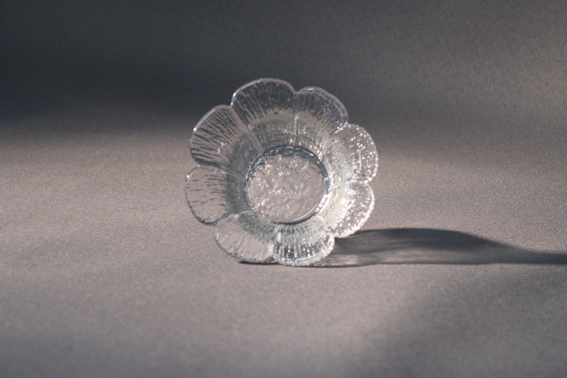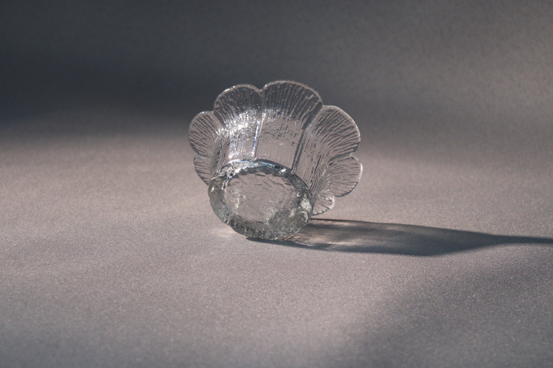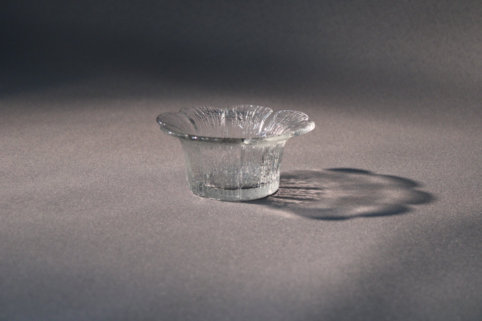Herkkä ja kaunis Terälehti-tuikkukippo Mäntsälän Lasisepiltä. Tämä kirkas lasiesine on valmistettu käsityönä Suomessa, ja sen muotoilu jäljittelee kukkien terälehtiä – luoden elävän ja orgaanisen vaikutelman.